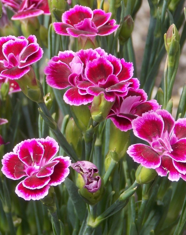 Karanfil je višegodišnja zimzelena biljka koja formira kompaktan busen sa uskim sivo-zelenim lišćem, iz kojeg izrastaju cvetne drške sa pojedinačnim poluduplim cvetovima tamno ružičaste boje sa svetlim, gotovo belim nazubljenim ivicama. Cvetovi imaju intenzivan miris i cvetaju od sredine proleća do polovine jeseni. Biljka je osunčana, zahteva dobro drenirano, umereno plodno zemljište i umereno zalivanje. Dostiže visinu od 30-40 cm, a koristi se u mešovitim cvetnjacima, kombinaciji sa žbunjem, kao pokrivač tla, u kamenjarima i žardinjerama. Efektna je u kontrastnim kombinacijama boja i može se koristiti i kao rezani cvet. Redovno uklanjanje precvetalih cvetova podstiče njen rast.